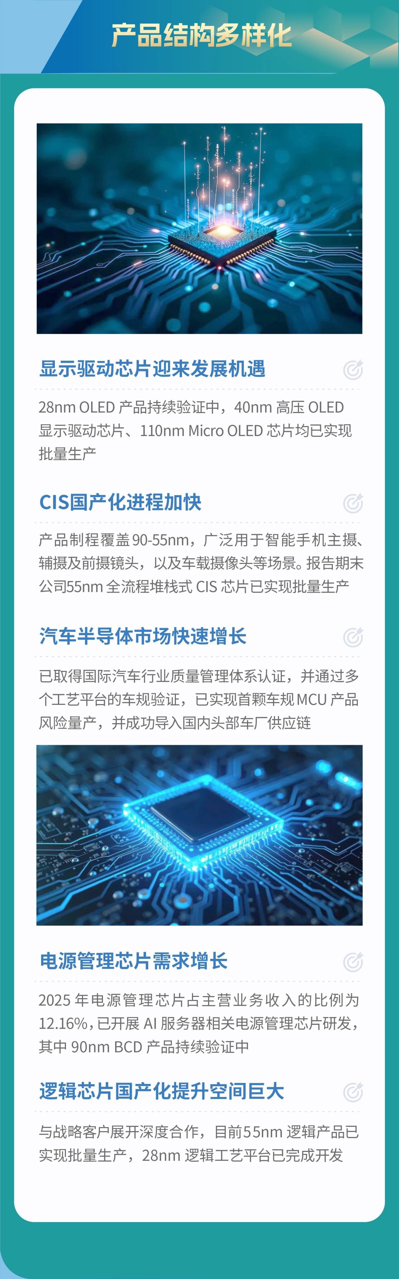结合市场动态、客户需求及自身发展战略,晶合集成持续进行产能扩充、拓展产品应用领域及开发高阶工艺平台,不断推出有市场竞争力的新产品,进一步优化产品结构。2025年,晶合集成研发投入14.53亿元,同比增长13.2%,28nm OLED产品持续验证中,28nm逻辑工艺平台完成开发,40nm高压OLED显示驱动芯片、55nm全流程堆栈式CIS芯片、55nm逻辑芯片、110nm Micro OLED芯片均实现批量生产。